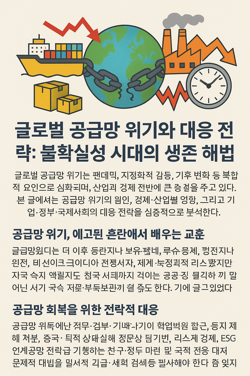글로벌 공급망 위기는 팬데믹, 지정학적 갈등, 기후 변화 등 복합적 요인으로 심화되며, 산업과 경제 전반에 큰 충격을 주고 있다. 본 글에서는 공급망 위기의 원인, 경제·산업별 영향, 그리고 기업·정부·국제사회의 대응 전략을 심층적으로 분석한다.