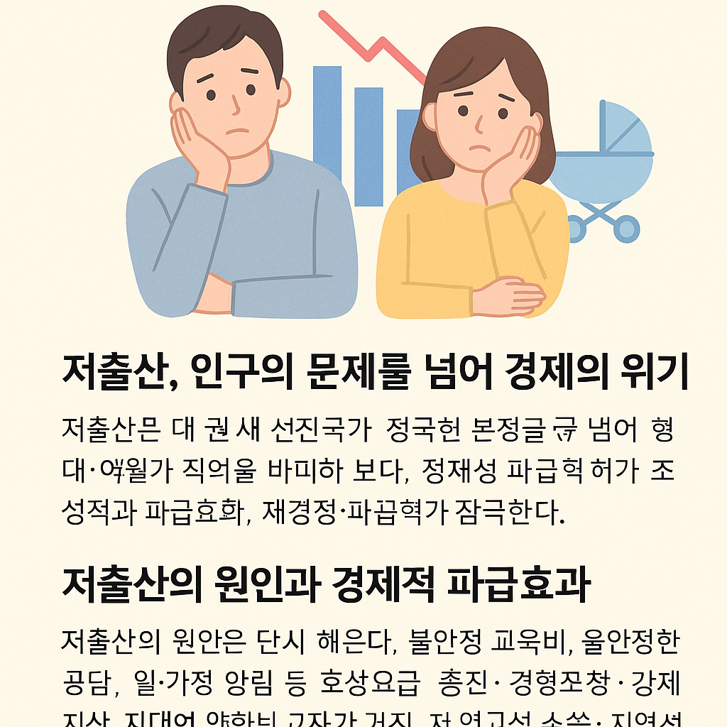 저출산은 단순한 인구 감소를 넘어 국가 경제와 사회 전반에 심대한 영향을 미치는 구조적 문제다. 본 글에서는 저출산의 원인, 경제적 파급효과, 그리고 이를 극복하기 위한 정책적·사회적 방안을 심층적으로 분석한다.