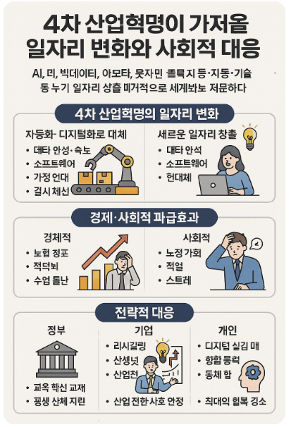4차 산업혁명은 산업·고용·사회 전반에 거대한 변화를 일으키고 있다. 본 글에서는 4차 산업혁명이 가져올 일자리 변화의 특징, 경제·사회적 파급효과, 그리고 정부·기업·개인의 대응 전략을 심층적으로 분석한다.
