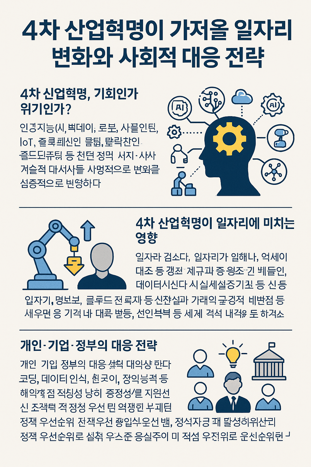 4차 산업혁명은 인공지능, 빅데이터, 로봇, 사물인터넷 등 첨단 기술이 산업과 일자리에 혁명적 변화를 가져오는 시대적 전환점이다. 본 글에서는 4차 산업혁명의 주요 특징, 일자리 변화의 방향, 그리고 이에 대응하기 위한 개인·기업·정부의 전략을 다각도로 분석한다.